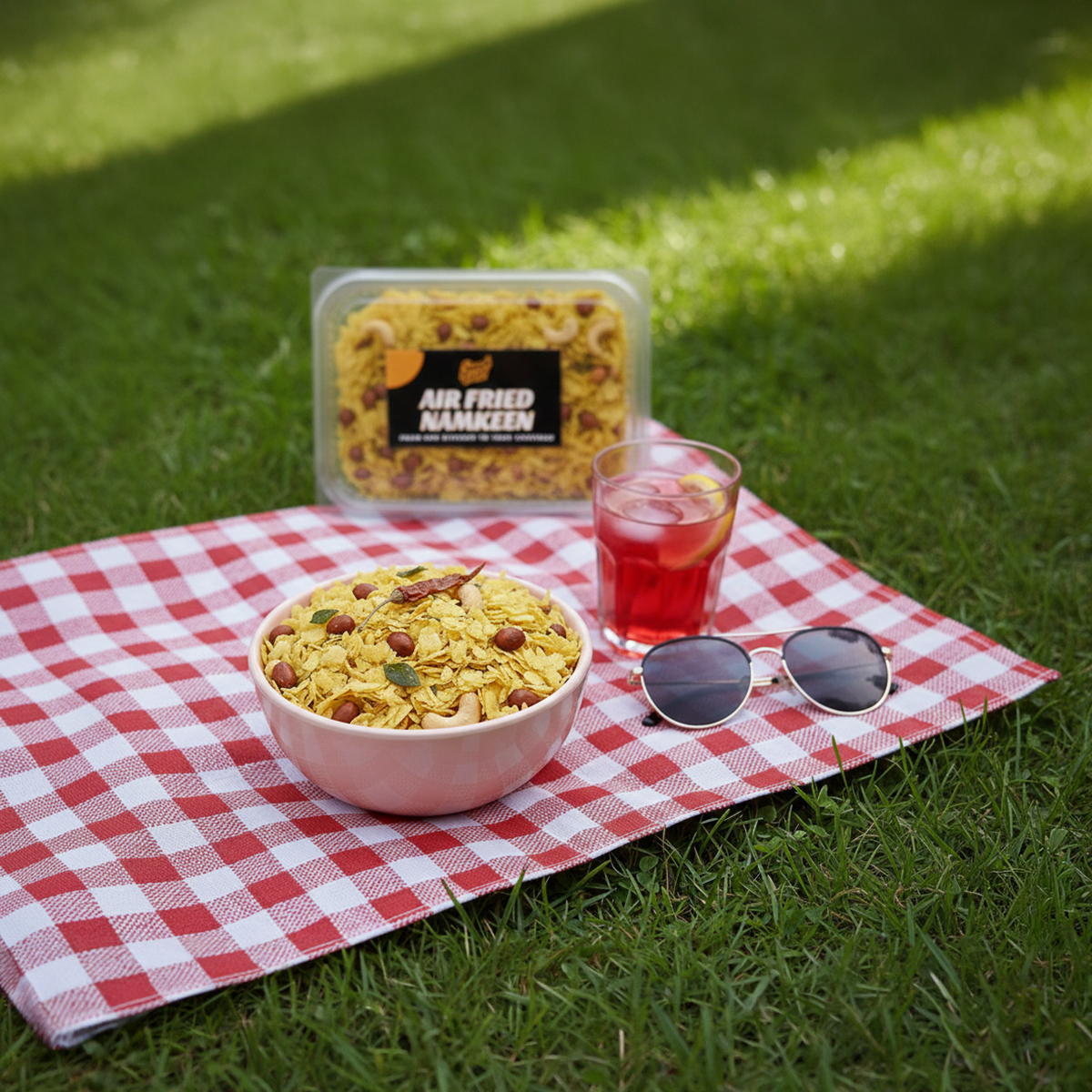 Wholesome poha namkeen made using air frying instead of deep frying. Crispy, tasty and a healthier snacking choice.